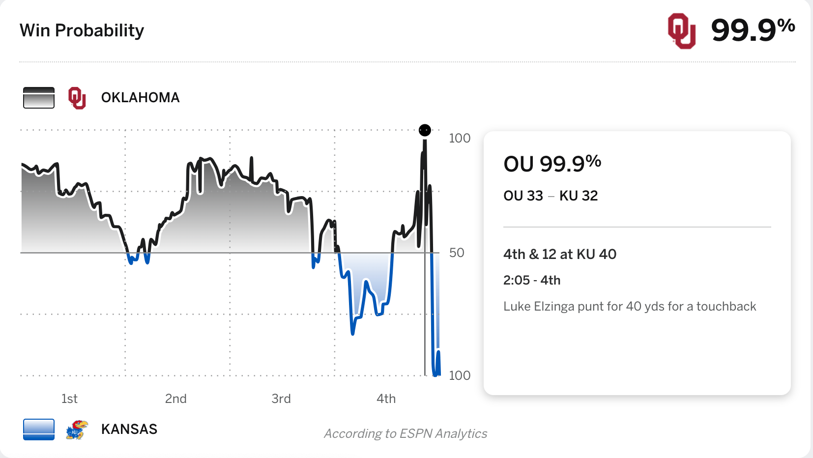 - After the delay Oklahoma took approximately nine seconds to tie the game. Then KU fumbled the kickoff and OU immediately took the lead. I started having vibes of the 1991 Nebraska game when KU lead 17–0 after the first quarter and we were all losing our minds then we still managed to lose 59–23. Calvin fucking Jones.