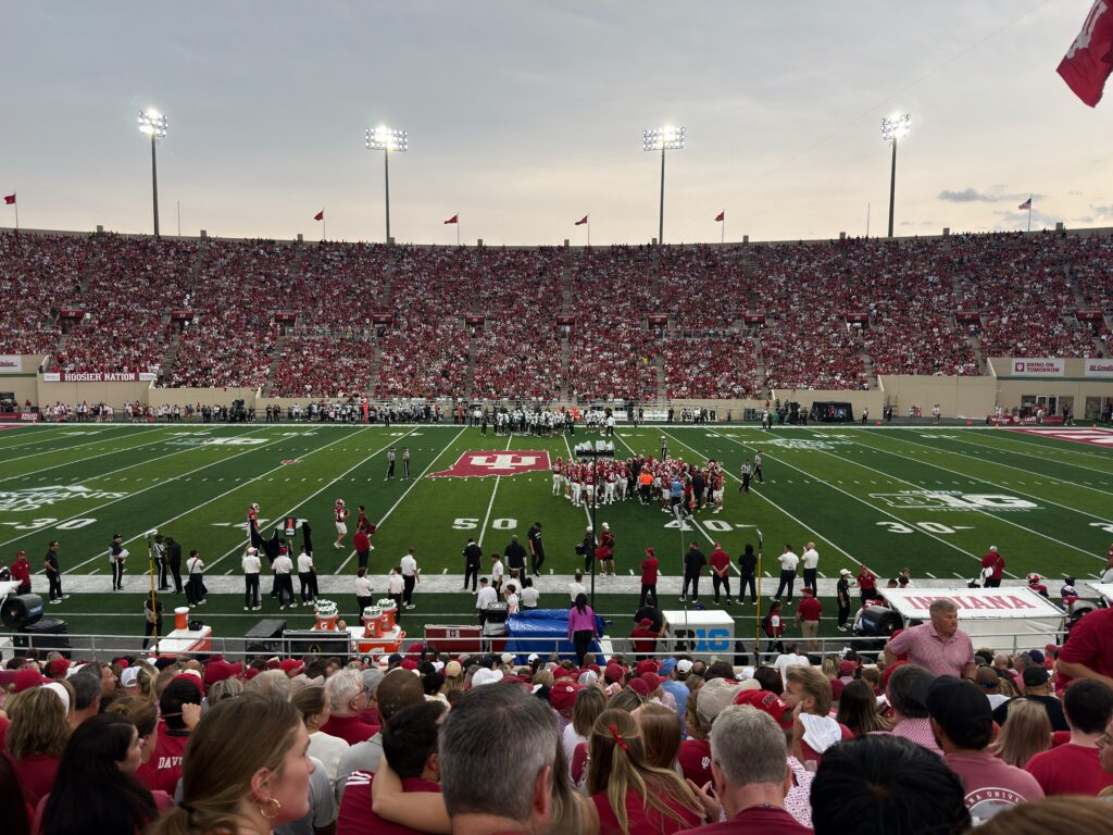 We made it to our seats midway through the first quarter, just as IU took the lead. Unlike the game against Michigan State we went to four years ago, this time there were no sections of Spartan green scattered through the crowd. The stadium was absolutely packed and nearly everyone was wearing Cream and Crimson.[1] This was my fourth trip to an IU game. As weird as their stadium is in some ways, when it is completely filled it is a really good environment. It is compact, completely closed in, and you are close to the field. It was quite loud.